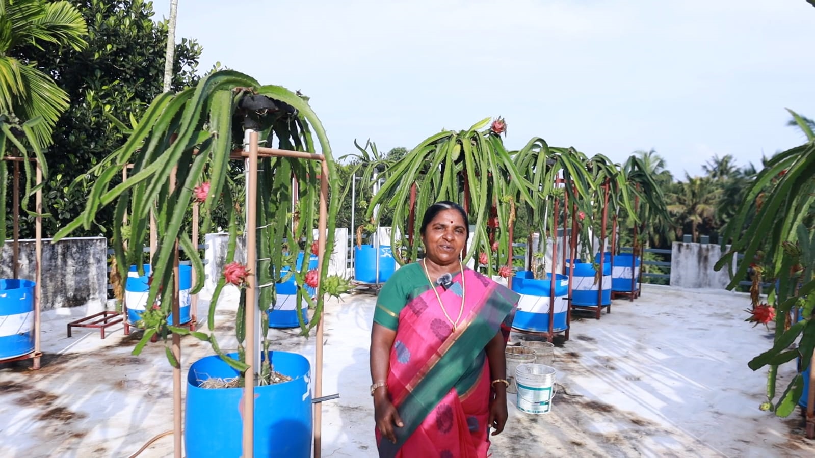 കൊല്ലം ചാത്തന്നൂരിലെ രമാഭായിയുടെ വീട്ടുമുറ്റത്തും പറമ്പിലും മട്ടുപ്പാവിലും നിറയെ ഡ്രാഗണ്ഫ്രൂട്ട് കായ്ച്ചു നില്ക്കുന്നത് കാണാം. 90 പോസ്റ്റുകളിലായാണ് ഡ്രാഗണ്ഫ്രൂട്ട് തൈകള് നട്ടിരിക്കുന്നത്. തൈകള് നട്ടു ആറാം മാസം മുതല് ഫലം ലഭിച്ചു തുടങ്ങി. മറ്റ് ഡ്രാഗണ്ഫ്രൂട്ട് കര്ഷകരില് നിന്ന് വ്യത്യസ്തയാണ് ടീച്ചര്. എന്താണെന്നല്ലേ... മണ്ണില്ലാ കൃഷിരീതിയിലൂടെയാണ് ടീച്ചര് ഡ്രാഗണ്ഫ്രൂട്ട് ചെടികള് വളര്ത്തുന്നത്. അതിലാകട്ടെ നിത്യവും കായ്ഫലവുമുണ്ട്. ടെറസിലാണ് മണ്ണ് ഇല്ലാതെ ഡ്രാഗണ് ഫ്രൂട്ട് വളര്ത്തുന്നത്. മണ്ണും വെള്ളവുമായി വീട് വൃത്തികേടാവുമോ എന്ന ആശങ്കയില് നിന്നാണ് മണ്ണില്ലാക്കൃഷി തുടങ്ങുന്നത്. ചാക്കില് കരിയിലയും കരിയിലപ്പൊടിയും നിറച്ച് കപ്പ കൃഷി ചെയ്തിരുന്നു, നല്ല വിളവും ലഭിച്ചു. ഇതു പോലെ പരീക്ഷണാടിസ്ഥാനത്തില് ഡ്രാഗണിന്റെ ഒരു തണ്ട് മണ്ണിലും മറ്റൊന്ന് കരിയില മിക്സഡ് കംപോസ്റ്റ് മിശ്രിതത്തിലും നട്ടു. കംപോസ്റ്റിലെ തൈയ്ക്ക് രണ്ടാഴ്ചയ്ക്കുള്ളില് മുള വന്നു. മണ്ണില് നട്ടതു മുളയ്ക്കാന് ഒന്നര മാസം സമയമെടുത്തു. അങ്ങനെ 2023ല് മണ്ണില്ലാകൃഷിയിലേക്ക് കടന്നു. കരിയിലയും പച്ചിലയും അറക്കപ്പൊടിയും നെല്ല് കുത്തിയ തവിടും ചേര്ത്ത് വലിയ അളവില് കംപോസ്റ്റ് മിശ്രിതം തയാറാക്കി. വേപ്പിന്പിണ്ണാക്കും എല്ലുപ്പൊടിയും ആദ്യനാളില് ഉപയോഗിച്ചിരുന്നുവെങ്കിലും ഇപ്പോള് ഉപയോഗിക്കാറില്ല. 50 ബാരലില് മണ്ണില്ലാക്കൃഷിരീതിയിലൂടെ ഡ്രാഗണ് ഫ്രൂട്ട് നട്ടു വീടിന് മുകളില് കൃഷി ആരംഭിച്ചു.